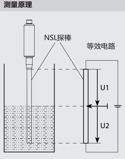 NSL是一款就有二次測(cè)量原理的電位式連續(xù)液位傳感器。電位式測(cè)量技術(shù)(測(cè)量原理見圖2所示)通過測(cè)量電極棒和金屬容器壁之間的電壓比變化來測(cè)量液位。由于介質(zhì)的導(dǎo)電率以及電容特性,介質(zhì)內(nèi)部會(huì)形成一個(gè)電流場(chǎng)。而由這個(gè)電流場(chǎng)所產(chǎn)生的電壓比與探棒浸沒長度是成比例的。因?yàn)闇y(cè)量只考慮電壓比這一項(xiàng)參數(shù),因此介質(zhì)的特性,特別是導(dǎo)電率的大小,對(duì)測(cè)量結(jié)果不會(huì)產(chǎn)生任何影響。